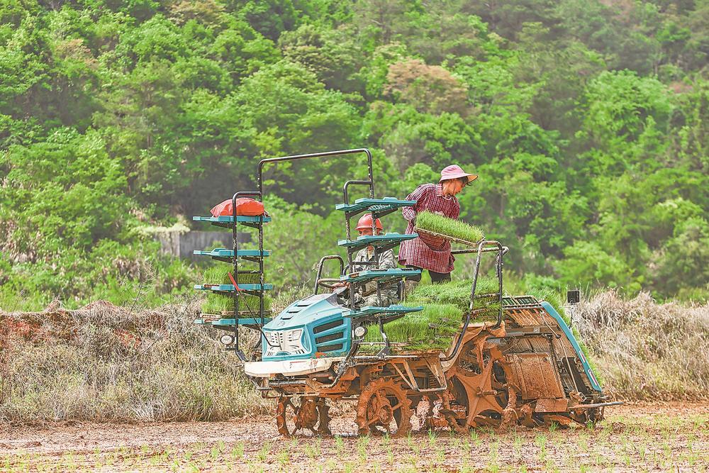 近日,在宁化县湖村镇粮安农机专业合作社的水稻田里,2台高速插秧机在田间来回穿梭、匀速作业,一株株嫩绿的秧苗被整齐均匀地插入水田,稻田逐渐披上了一层绿装。借助机械化作业,每台插秧机单日可插秧30亩,效率远超人工,省时省力又节本。