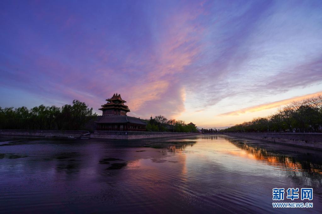 这是4月12日拍摄的晚霞映衬下的故宫角楼。