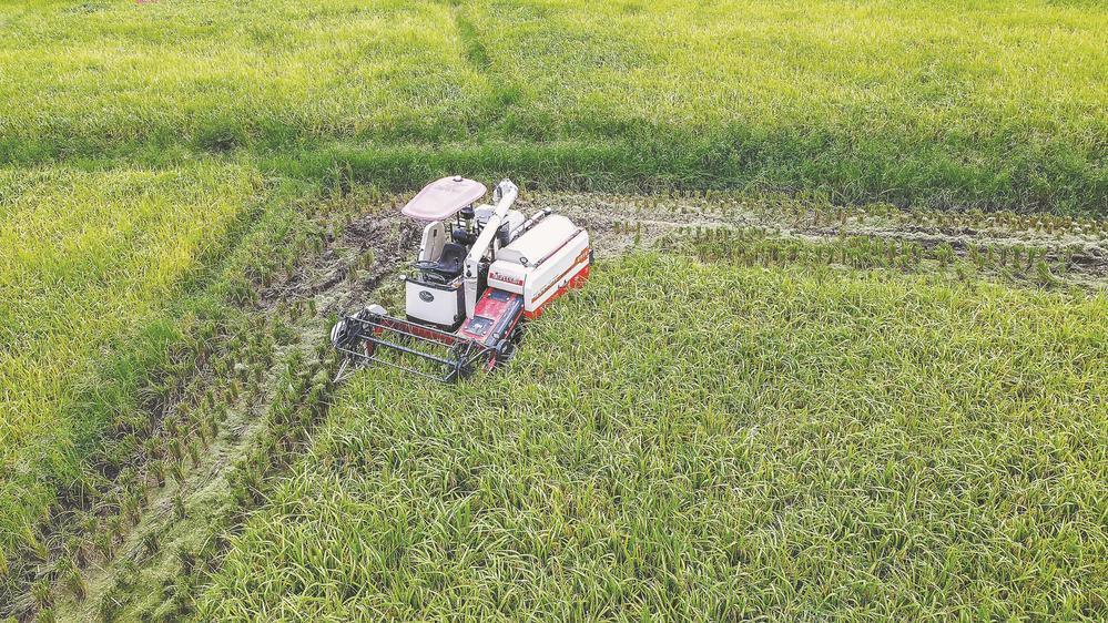 无人驾驶收割机在再生稻AI智慧农场作业。(新罗区融媒体中心供图)