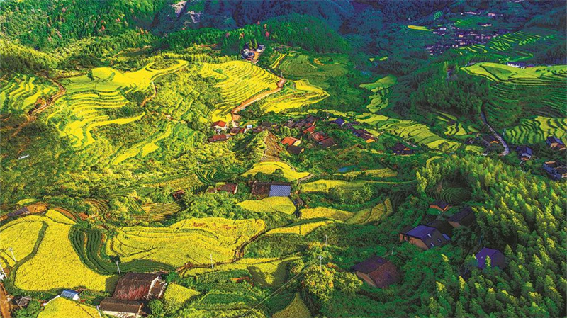 金秋时节,武夷山市吴屯乡后源村千亩梯田稻浪滚滚,构成一幅美丽的田园画卷。图为22日拍摄的后源村(无人机照片),当地农民忙着收割稻子,一派丰收景象。