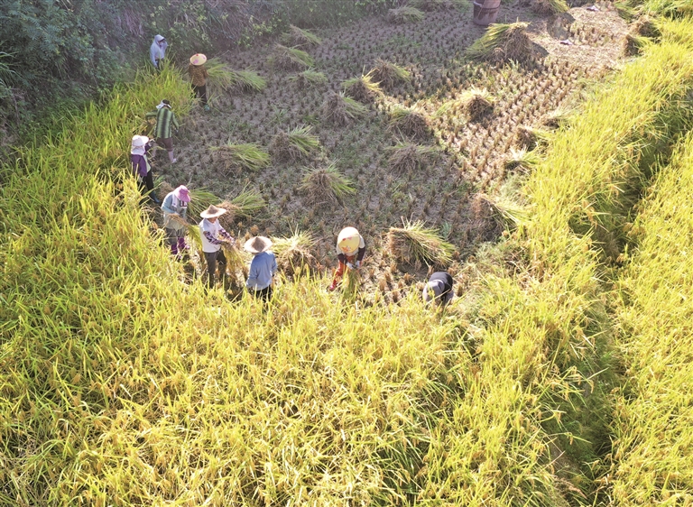 10月11日,福安市坂中畲族乡仙岩村,一片片金黄的稻田点缀山间,村民忙着收割、打谷,一派丰收景象。2022年以来,该村通过对接市农垦公司,由村党支部领办合作社,复垦撂荒地130亩种植水稻和地瓜,带动农民增收10多万元。