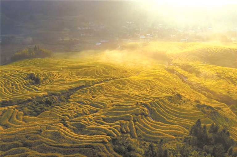 10月中旬,熙岭乡四坪村的食光梯田迎来丰收季。沉甸甸的水稻颗粒饱满,田中稻花鱼游弋不时泛起涟漪,构成一幅“稻鱼共生”的生态图景。