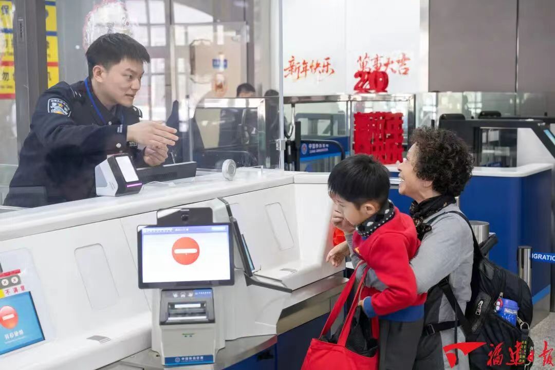 2月14日,福州黄岐客运站通关现场,边检民警耐心为老人及孩子服务。福建日报记者 王毅 摄