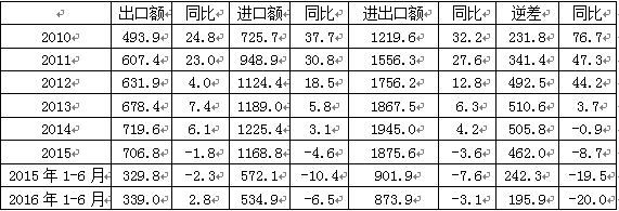 (一)国际农产品价格总体保持低位,贸易额同比下降。2001-2014年农产品贸易额年均增长16.1%,2015年首次下降4.6%,今年上半年继续下降3.1%。其中进口额同比下降6.5%,出口额增长2.8%。国际农产品价格继续走低是贸易额下降的主要原因。近年来全球主要农产品价格全面下跌,今年上半年继续低位运行。1-6月FAO食品价格指数同比降幅逐月收窄,由17.1%收窄到1.0%,为2010年以来同期最低。