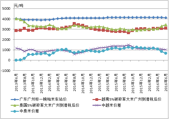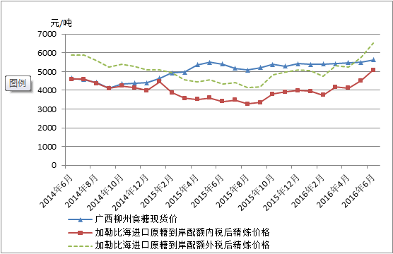 (四)食糖。近几年在国内外价差驱动下,食糖进口迅猛增加。2001-2009年进口100万吨左右,2010年进口167.2万吨,2011年以来进口量连续超过194.5万吨的配额量,2015年创纪录进口486.6万吨,同比增加39.0%。今年上半年高位回落,共进口133.5万吨,同比减少42.3%,占2015/16年度产量(按870万吨计算)的15.3%,主要进口国为巴西(56.7%)、古巴(22.5%)和泰国(8.2%)。由于泰国、印度等几大产糖国干旱减产,国际食糖库存连续5年增加后首次下降,国际糖价升高,配额内进口利润下降,今年5-6月配额外进口已无利润(图3),企业进口动力减弱,进口量下降。