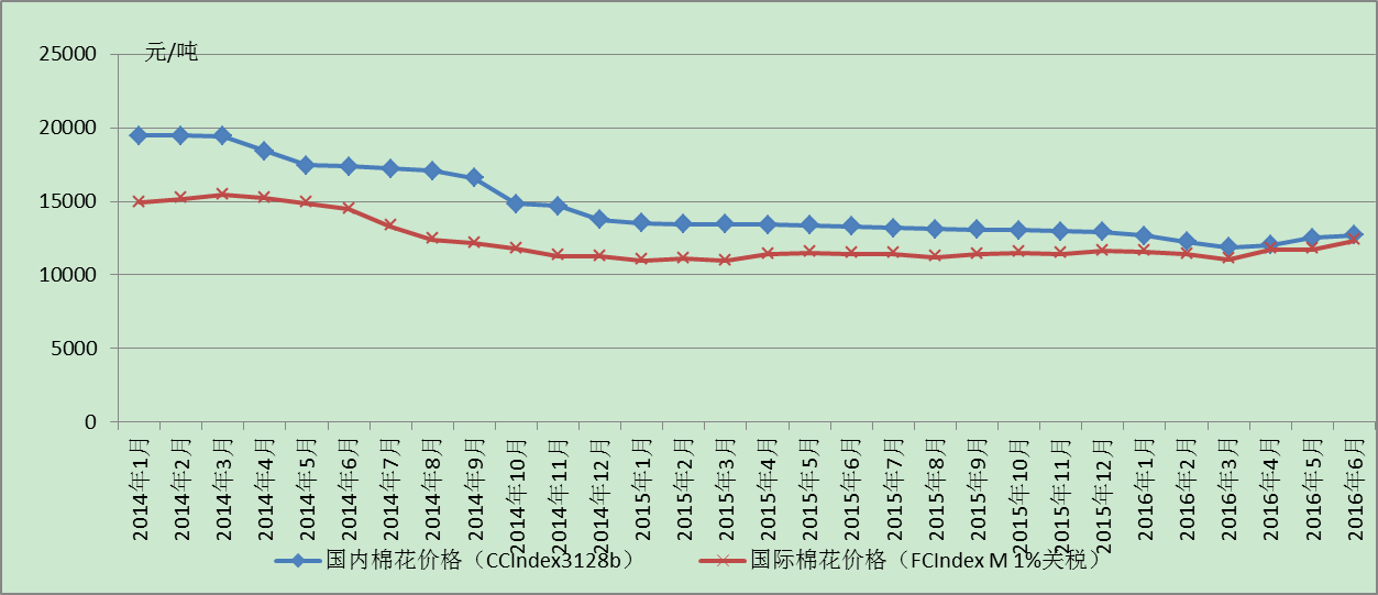 2014年棉花目标价格改革后,国产棉价格更多由市场决定,国内外价差进一步缩小。2016年6月进口棉配额内税后价与国产棉的价差收窄到357元/吨(图2),企业进口动力减弱。在去库存背景下,国家严格控制滑准税配额发放,也是棉花进口量下降的重要原因。