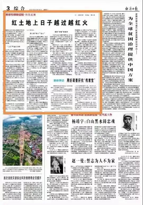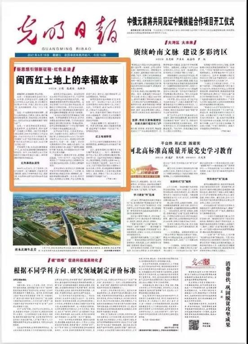 19日,《光明日报》头版头条刊登报道《闽西红土地上的幸福故事》及短评《让红土地上的故事常读常新》。报道说,闽西是一片备受牵挂的革命老区。“党史事件多、红色资源多、革命先辈多”,在福建工作期间,习近平同志就多次到此调研;2014年全军政治工作会议期间,习近平总书记在古田同老红军、军烈属和“五老”同志代表亲切座谈,强调“我们永远不要忘记老区,永远不要忘记老区人民”。