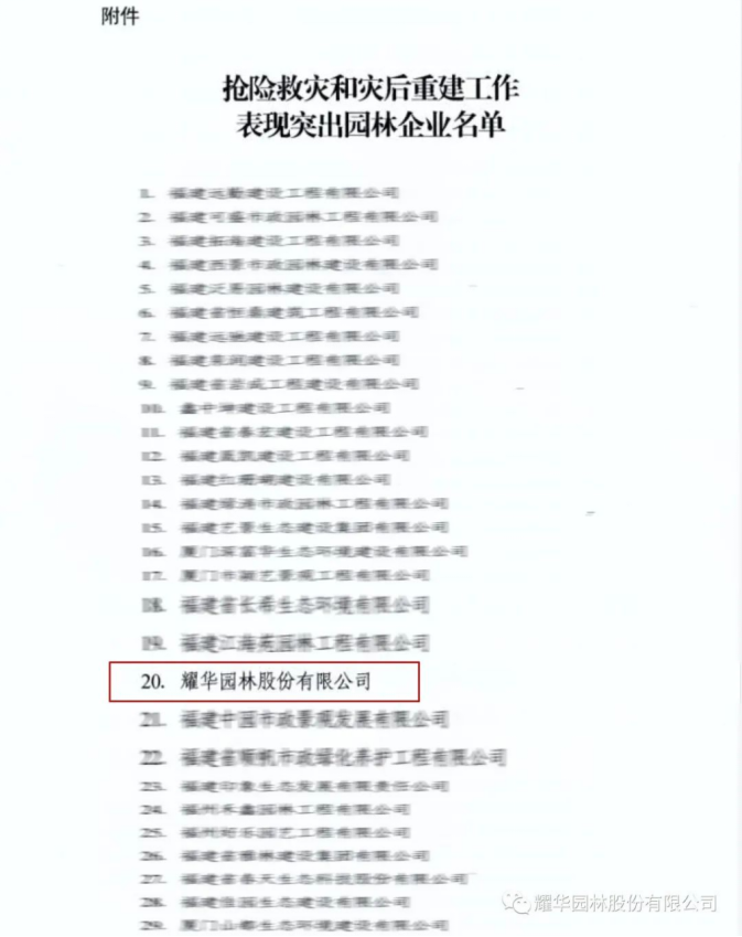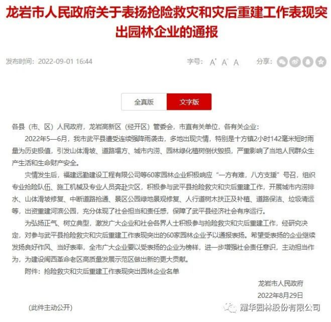 近日,耀华园林因积极参与抢险救灾受到龙岩市人民政府通报表扬。