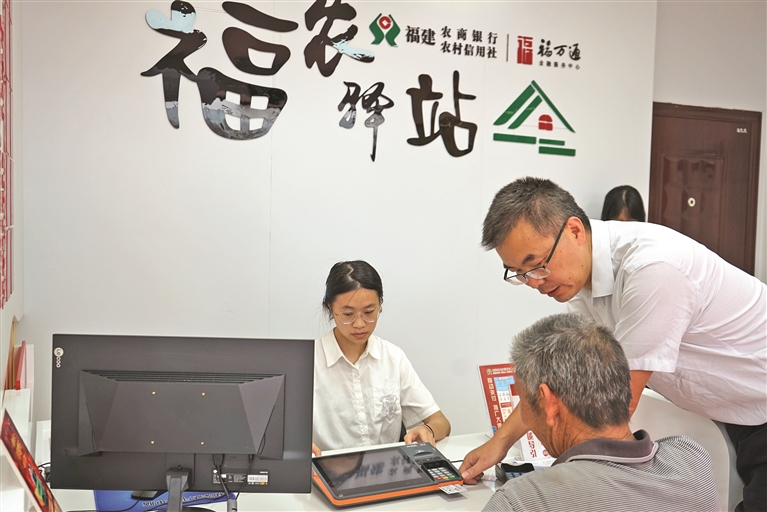 眼前的这家“福农驿站”是柘荣县首家乡村振兴“福农驿站”,由柘荣县农信联社、东源乡政府、国网柘荣供电公司共同设立,于今年9月6日正式投入运行。与常规的普惠金融服务点不同的是,“福农驿站”不仅设有可满足村民社保缴存支取、小额存取款、话费充值、零币兑换、贷款咨询等基础金融需求的金融服务角,还设置了农产品购销服务平台、服务便民点、政务服务模块等,是集“金融、电商、物流、民生、政务”多位一体的综合金融场景服务站,让村民在家门口就能享受日常的基础金融服务和民生服务。